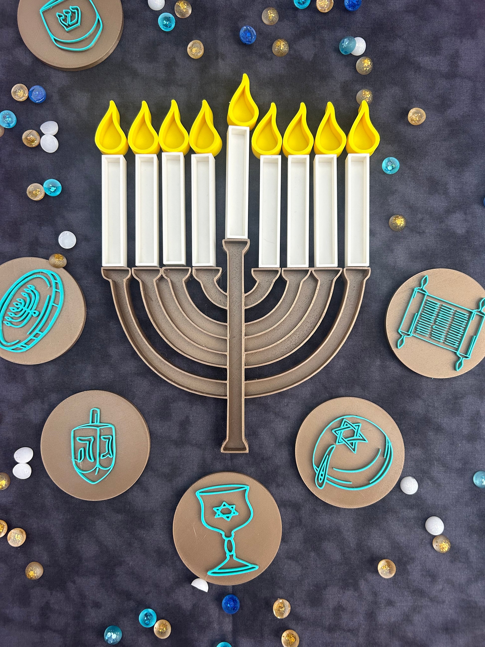Menorah puzzle tray - consists of a main candle holder tray, 9 separate candle trays in white and 9 separate flame trays in yellow. This is a flat lay puzzle and the price includes all 19 parts