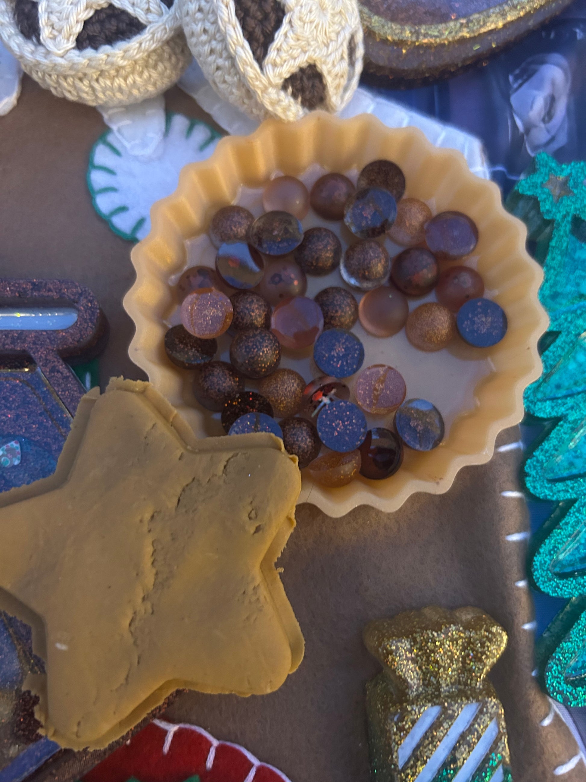 Mince pie kit consists of a resin tart case, a 3D printed star playdough cutter (designed & printed by myself) and a micro bag of brown (mince meat) Reusabase